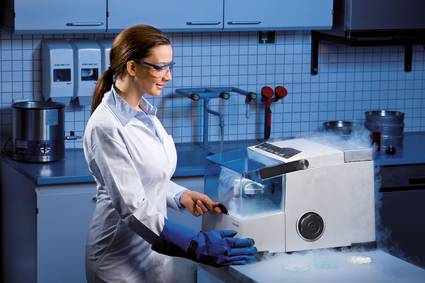 El CryoMill ha sido concebido para la molienda en frío. El recipiente molienda es enfriado continuamente con nitrógeno líquido por el sistema de refrigeración antes y durante el proceso de molienda. La muestra es fragilizada y los componentes volátiles se conservan.